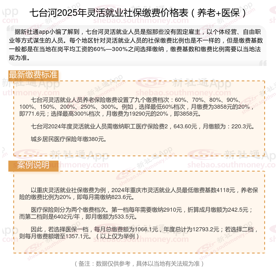据新社通app数据显示,七台河灵活就业人员养老保险缴费基数2024-2025年最新标准如下: