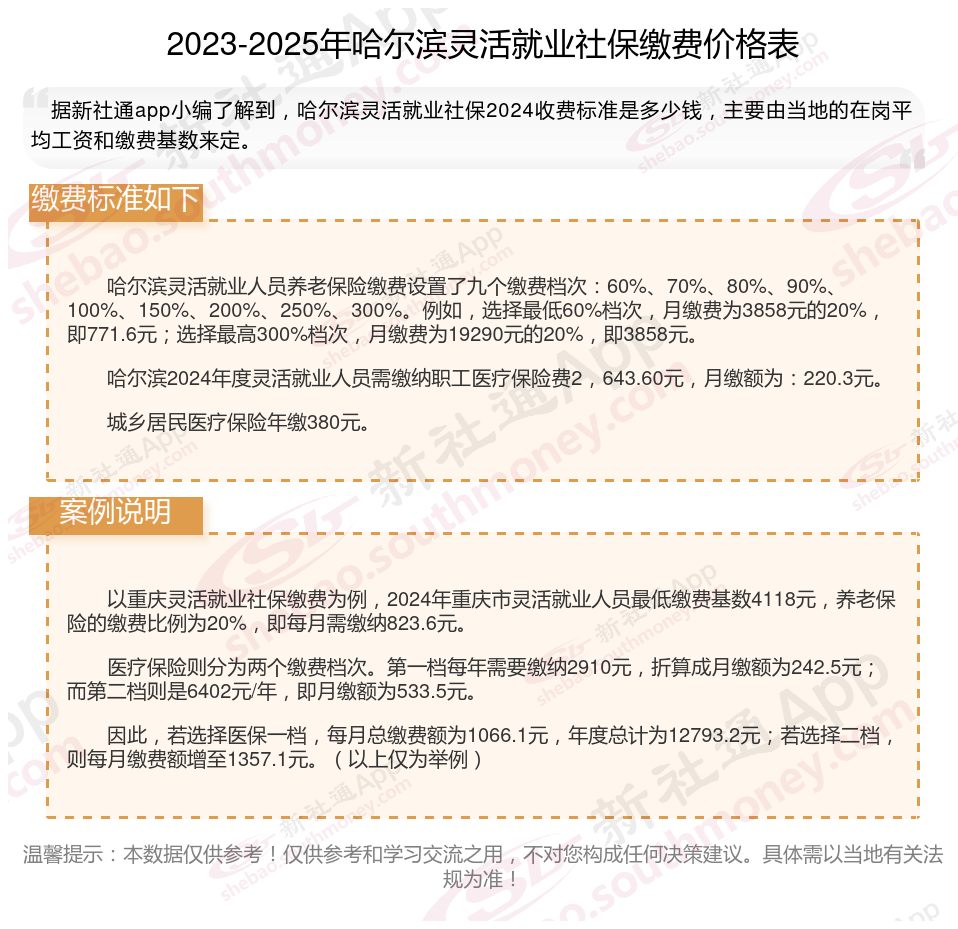 据新社通app数据显示,哈尔滨灵活就业养老保险缴费基数2024-2025年最新标准如下: