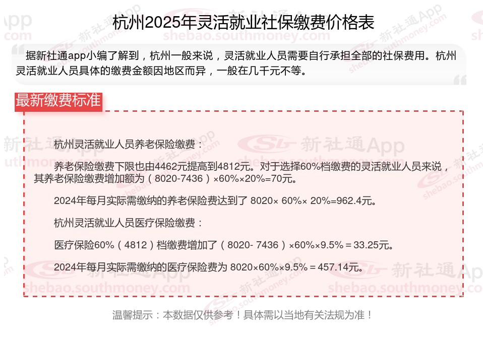 据新社通app数据显示,杭州灵活就业养老保险的缴费基数为:4462元。灵活就业人员参保缴费的比例为个人20%。