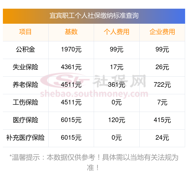 五险一金扣多少?宜宾五险一金扣多少钱?下表是2024-2025年宜宾社保费用明细参考,新社通app-社保缴费查询工具提供的最新数据如下: