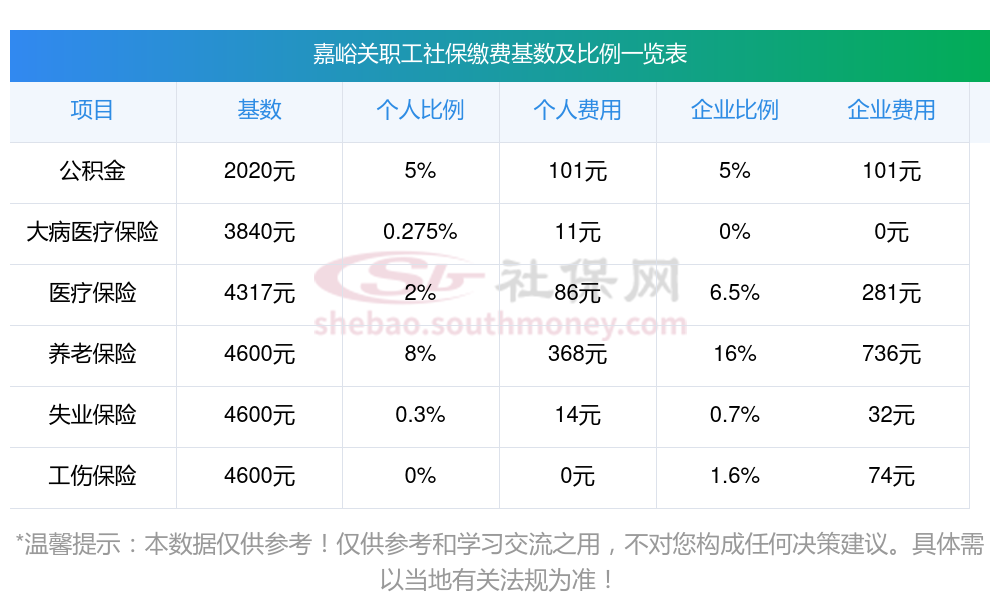 2025年嘉峪关社保缴费多少钱?下表是2023-2024年嘉峪关社保费用明细参考,新社通app-社保缴费查询工具提供的最新数据如下: