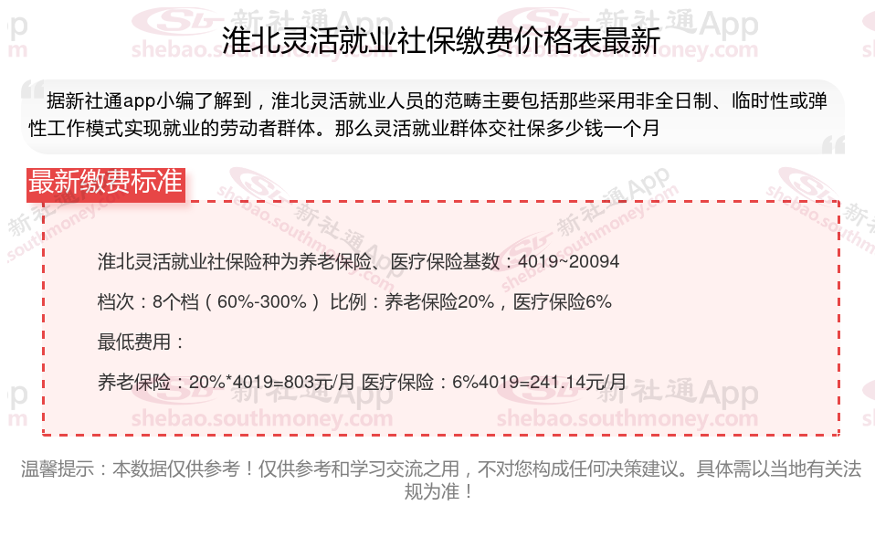 淮北灵活就业社保缴费标准,淮北灵活就业社保缴费标准是多少钱一个月?下表是2024-2025年淮北社保费用明细参考,根据新社通app-社保缴费查询工具提供的最新数据如下: