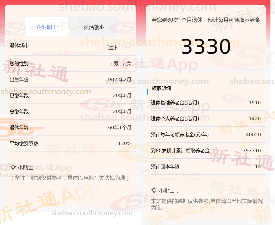 个人详情:男性,1965年出生,达州地区退休,累计缴费20年,缴费比例为130%。
