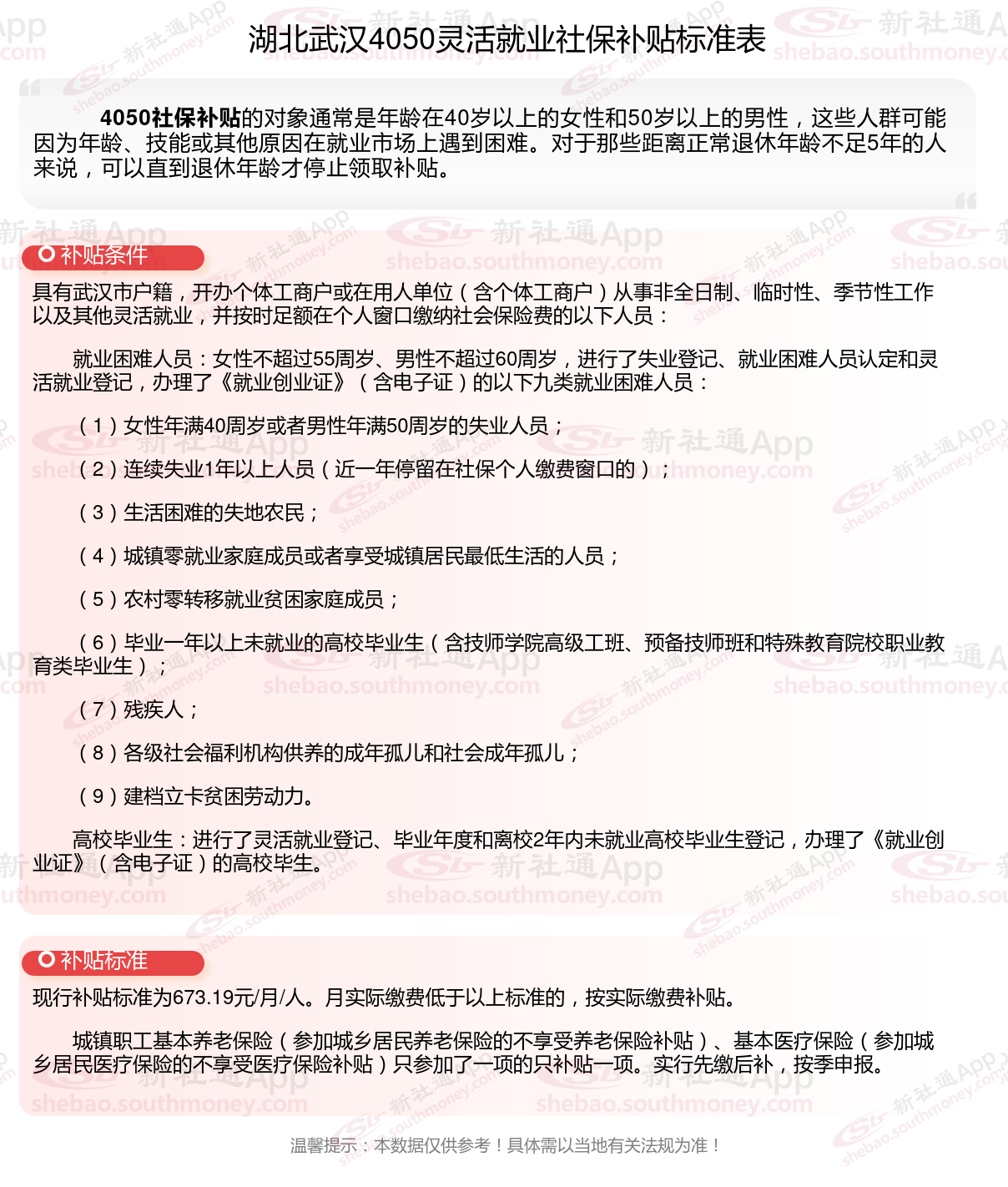 二2025年湖北武汉灵活就业4050社保补贴标准及条件是什么