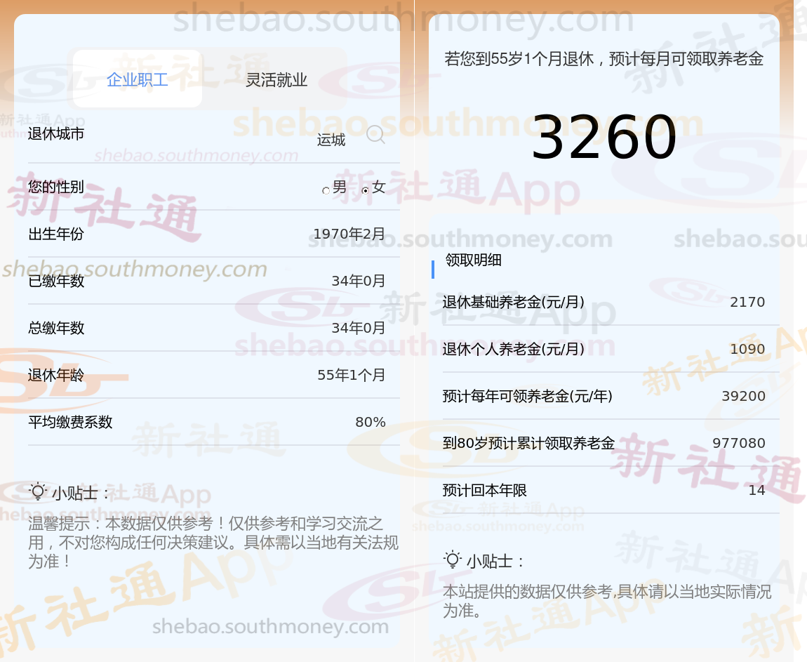 个人档案:女性,1970年出生,运城退休职工,社保缴费34载,档次80%。