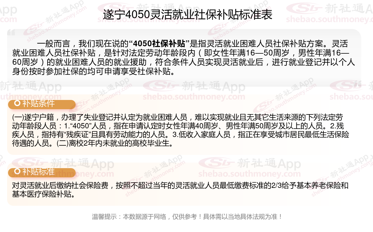 二、遂宁4050社保补贴标准及条件2025年,最新如下