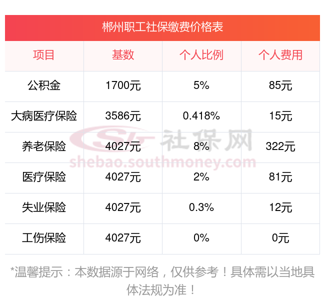 2025社保交多少钱?下表是2025年郴州社保费用明细参考,新社通app-社保缴费查询工具提供的最新数据如下: