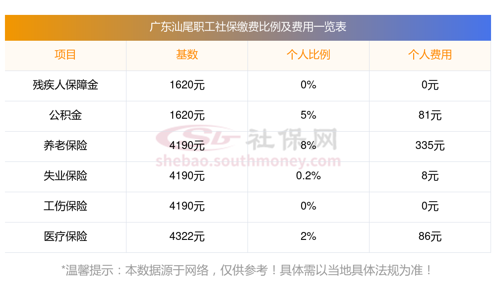 个人可以交社保吗?广东汕尾社保各基数的缴费比例是多少?和社保丫丫一起来看看,新社通app-社保缴费查询工具提供的最新数据如下: