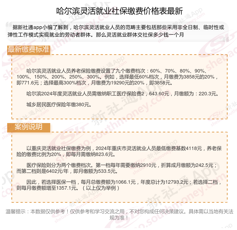 灵活就业社保缴费价格表来了!2024-2025年哈尔滨灵活就业人员社保需要缴费多少钱一个月?根据新社通app-社保缴费查询工具提供的最新数据如下: