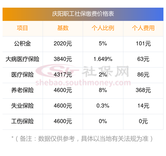 2025年庆阳社保缴费多少钱?下表是2024-2025年庆阳社保费用明细参考,新社通app-社保缴费查询工具提供的最新数据如下: