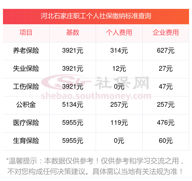 2025年河北石家庄5险缴费标准是多少,2025年河北石家庄社保缴费多少钱?下表是2025年河北石家庄社保费用明细参考,新社通app-社保缴费查询工具提供的最新数据如下:
