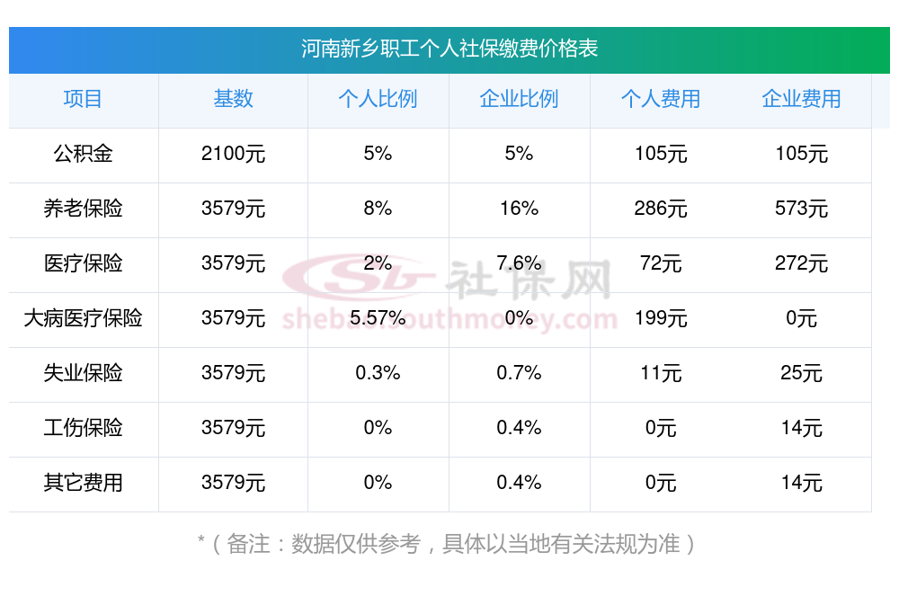 2025年河南新乡社保缴费多少钱?下表是2024-2025年河南新乡社保费用明细参考,新社通app-社保缴费查询工具提供的最新数据如下: