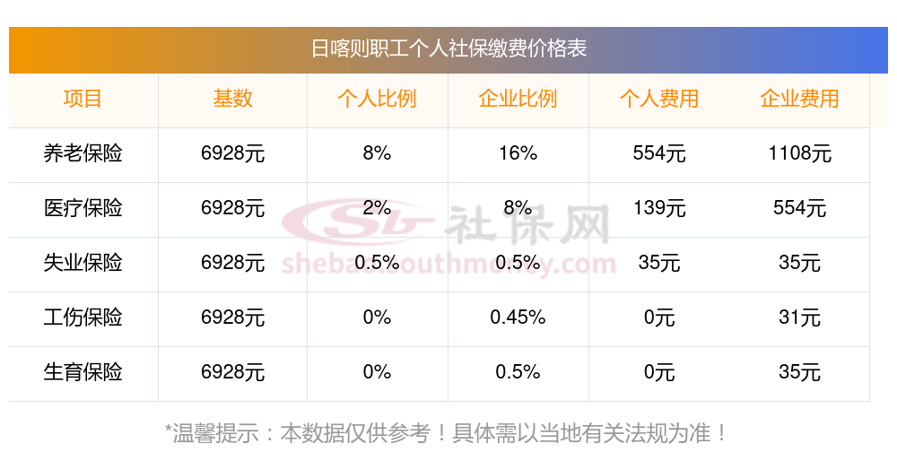 根据新社通app-社保缴费查询工具提供的最新数据, 日喀则社保缴费比例社保缴费比例包括以下几个部分: