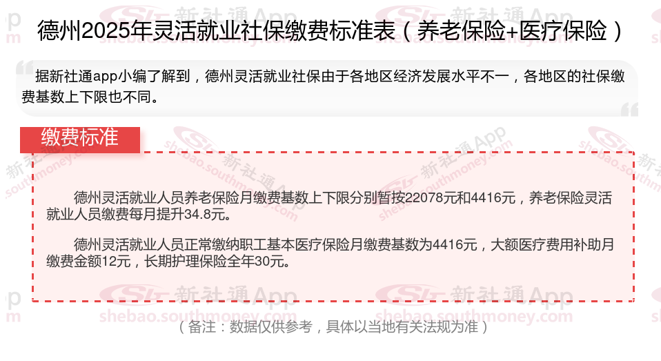 据新社通app数据显示,德州灵活就业养老保险缴费基数2024-2025年最新标准如下: