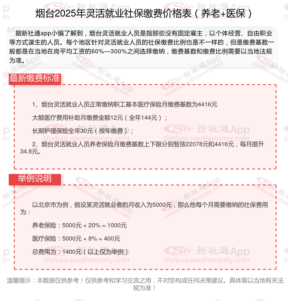 那么,烟台灵活就业人员社保缴费一个月多少钱?2025年烟台灵活就业人员社保缴费标准,根据新社通app-社保缴费查询工具提供的2025社保缴费标准详情数据: