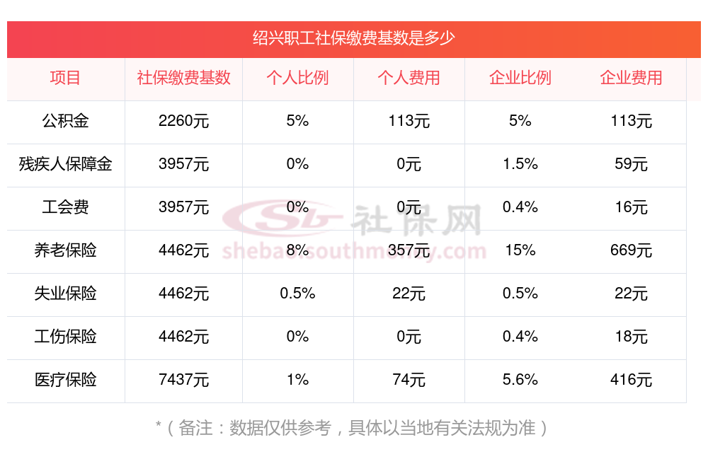 据新社通app显示,绍兴社保缴费基数2025年标准,(社保最低一个月要交多少钱)绍兴社保费用如下:
