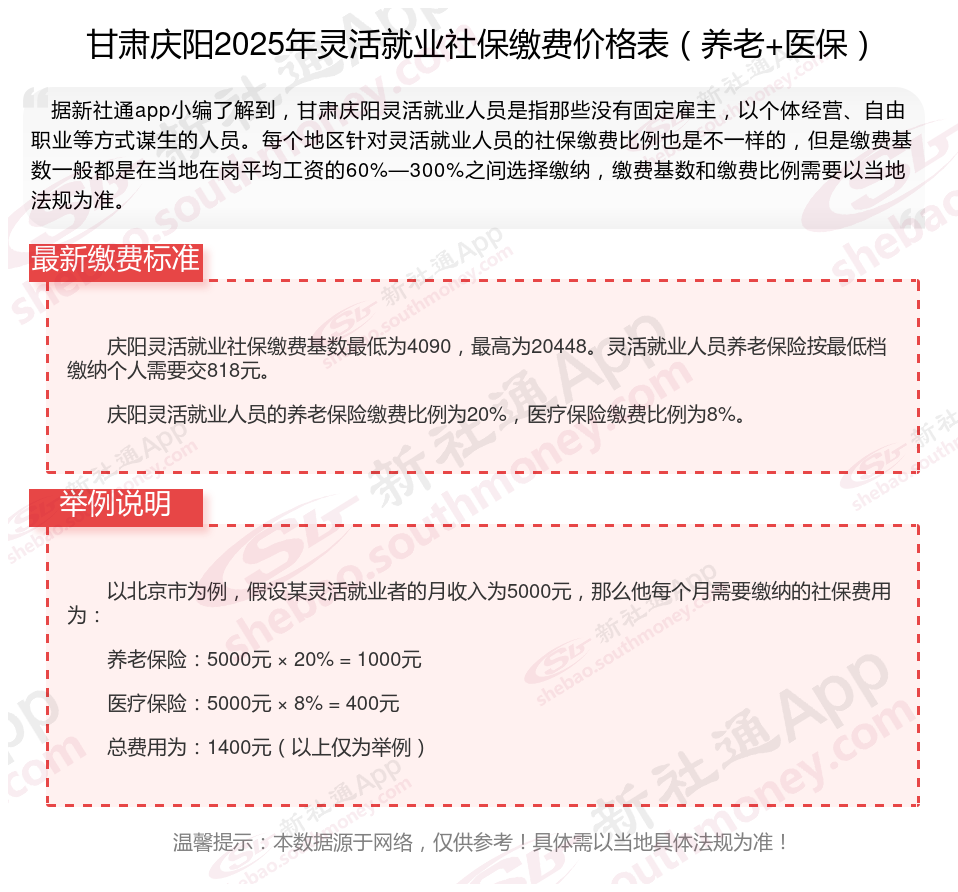 据新社通app数据显示,甘肃庆阳灵活就业养老保险最低缴费基数为:4317元;个人的缴费比例分别为:20%;