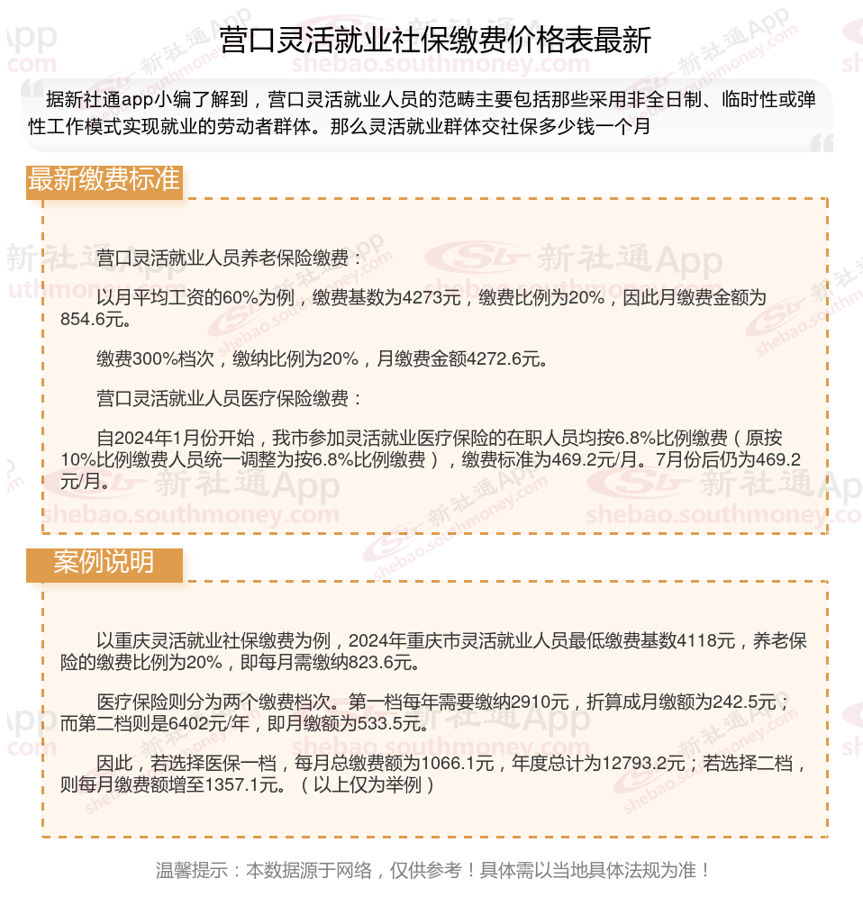 营口灵活就业人员社保缴费标准来了 营口灵活就业人员缴费多少钱怎么查?根据新社通app-社保缴费查询工具提供的2025社保缴费标准详情数据如下: