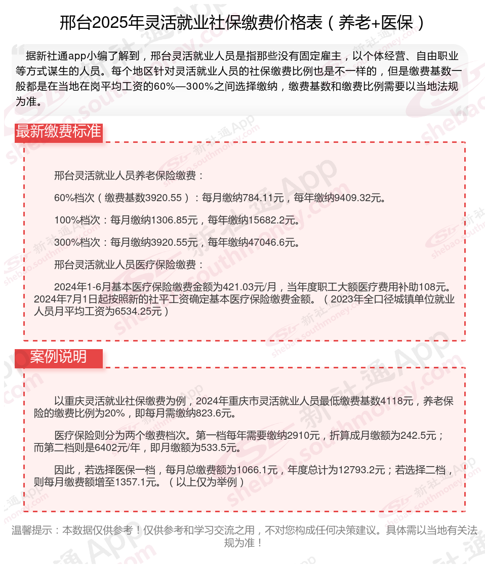 据新社通app数据显示,2024-2025年邢台灵活就业人员养老保险的缴费标准是根据缴费基数来确定的: