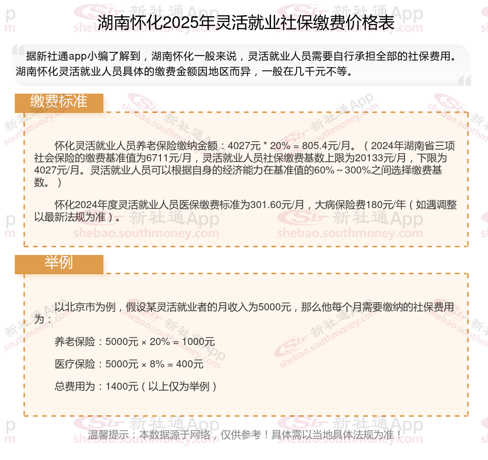 随着经济社会的不断发展,灵活就业群体不断地日益壮大,其社保缴费问题也愈发受到关注。那么2025年湖南怀化灵活就业人员社保交多少钱,你了解2025年湖南怀化灵活就业人员社保缴费基数及比例吗,接下来随新社通APP小编一起来看看。