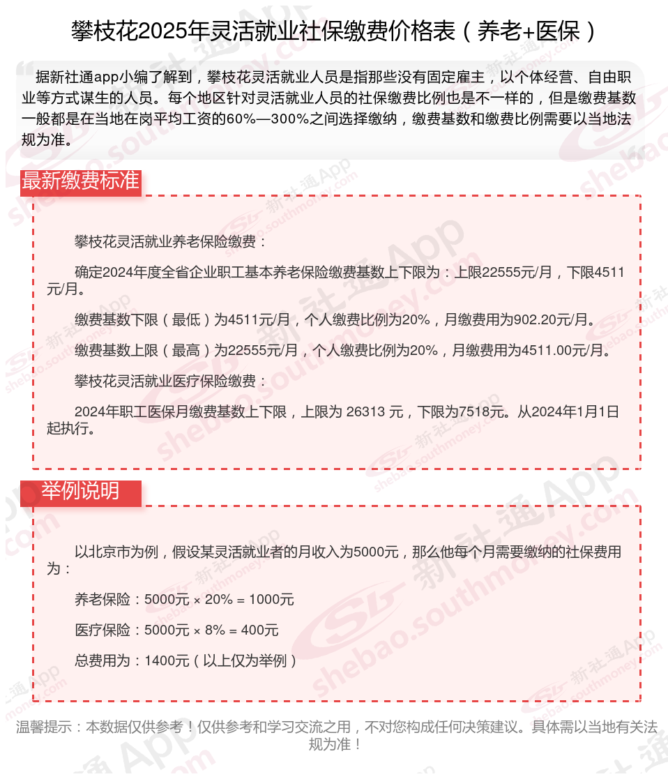 据新社通app数据显示,攀枝花灵活就业人员养老保险缴费基数2024-2025年最新标准如下: