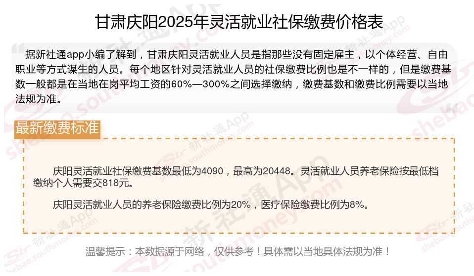 灵活就业人员自己交保险一个月多少钱?甘肃庆阳个体户社保缴纳金额是怎么计算?根据新社通app-社保缴费查询工具提供的最新数据如下: