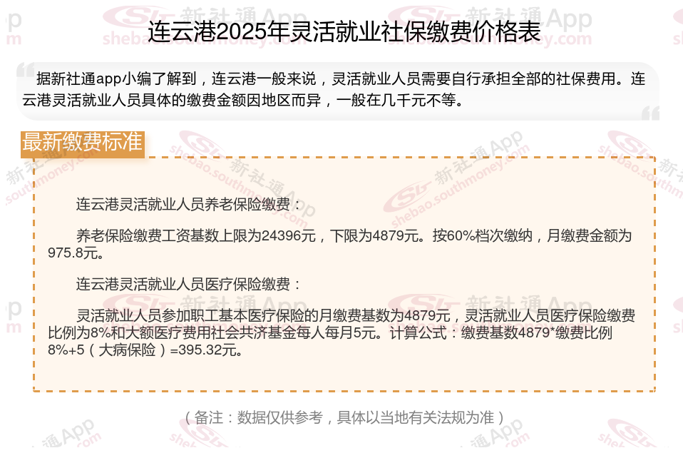 据新社通app数据显示,2024-2025年连云港灵活就业人员养老保险的缴费标准是根据缴费基数来确定的: