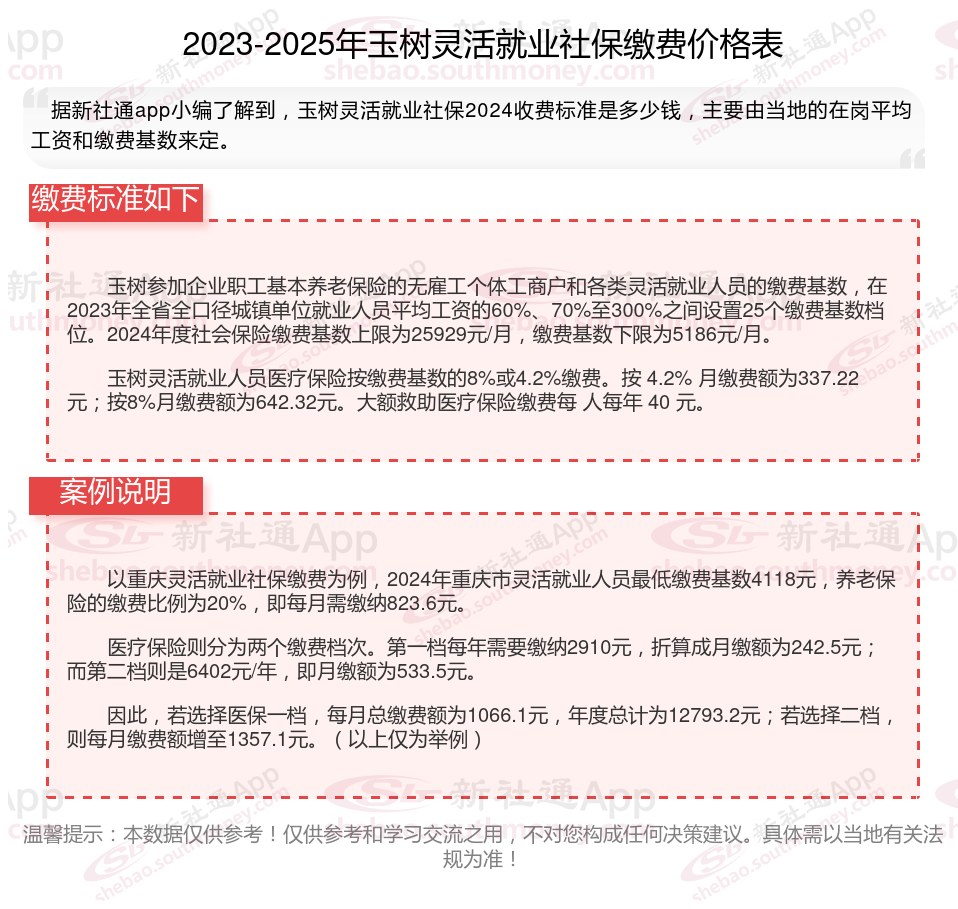 据新社通app数据显示,玉树灵活就业养老保险缴费基数2024-2025年最新标准如下: