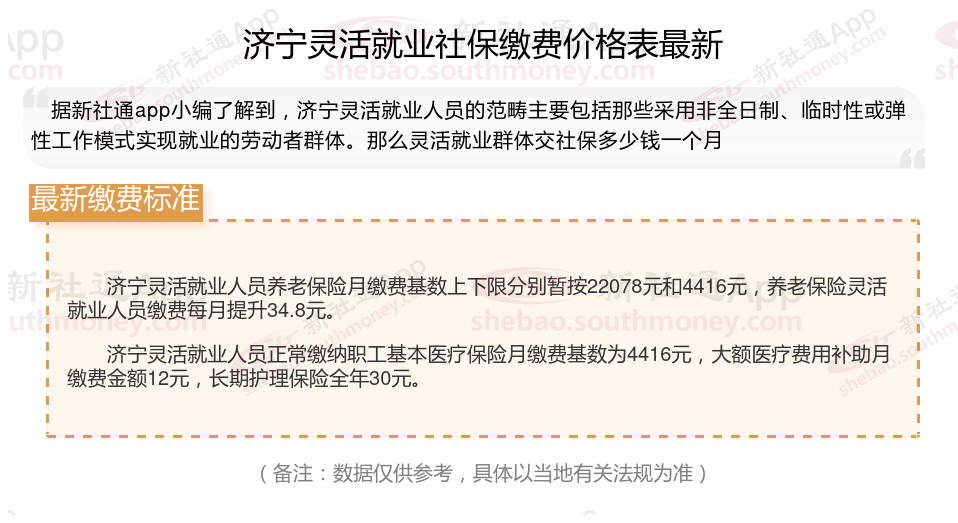 据新社通app数据显示,济宁灵活就业养老保险的缴费基数为:4416元。灵活就业人员参保缴费的比例为个人20%。