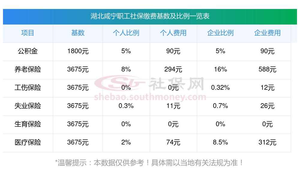 根据新社通app-社保缴费查询工具提供的最新数据,湖北咸宁地区2025年的社保缴费标准已经确定。以下是各项保险的缴费比例及相应金额(基于一定的缴费基数)的详细说明: