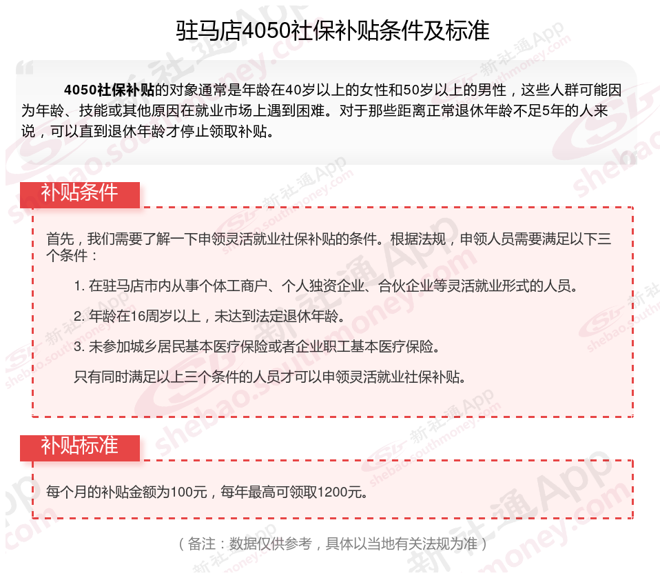 二、2025年驻马店4050社保补贴标准及条件,最新如下: