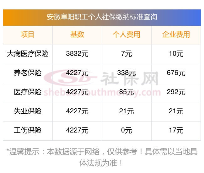 据新社通app显示,安徽阜阳社保缴费基数2025年标准,(社保最低一个月要交多少钱)安徽阜阳社保费用如下: