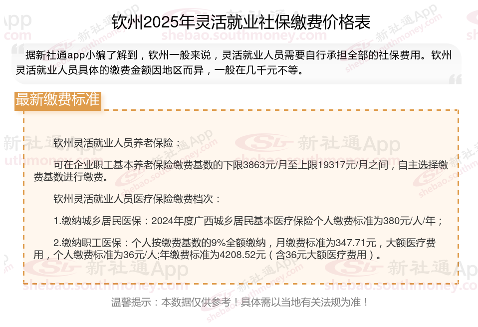 那么,钦州灵活就业社保缴费标准是多少?个人社保,要交多少钱一个月?根据新社通app-社保缴费查询工具提供的2025社保缴费标准详情数据: