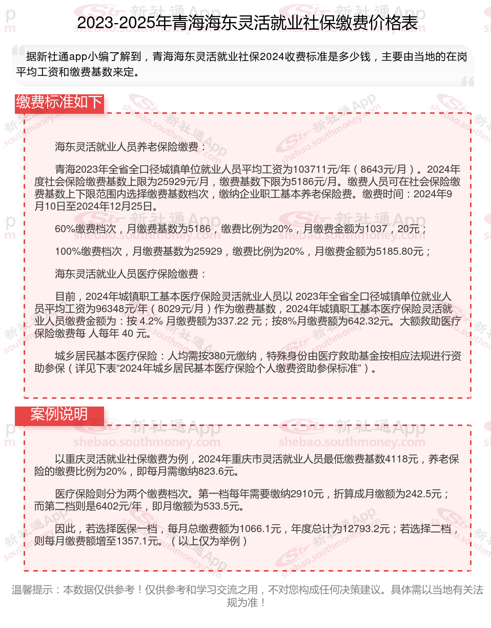青海海东灵活就业社保缴费标准,青海海东社保缴费多少钱?下表是2024-2025年青海海东社保费用明细参考,根据新社通app-社保缴费查询工具提供的最新数据如下: