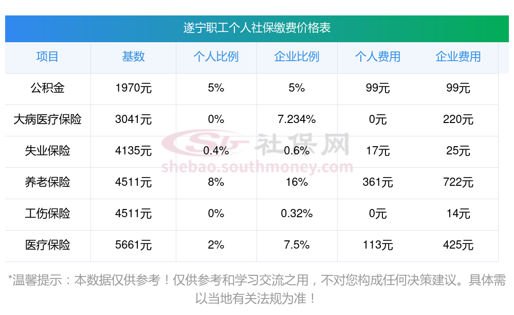 遂宁五险要扣工资多少钱一个月?遂宁缴费社保比例一览社保公司和个人各交多少?下表是2024-2025年遂宁社保费用明细参考,新社通app-社保缴费查询工具提供的最新数据如下: