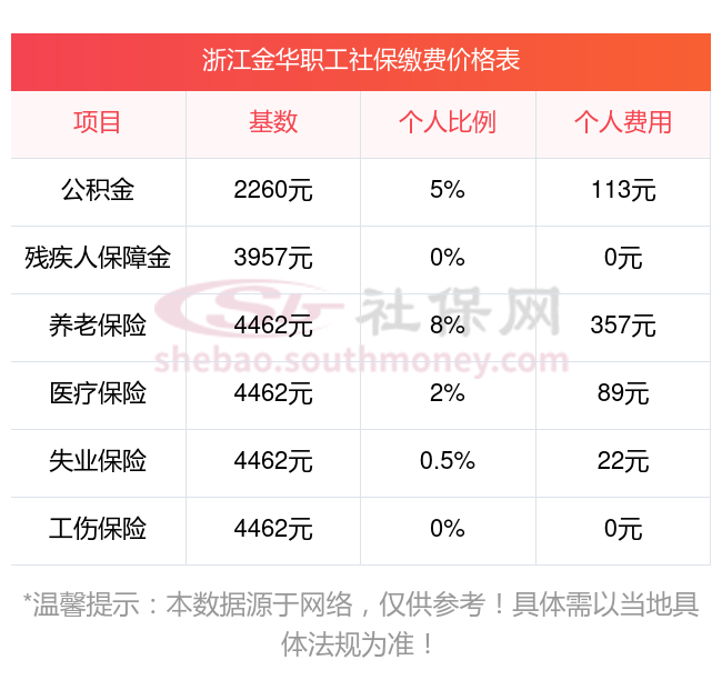据新社通app小编了解到,2025年浙江金华社保缴费基数参照为3579.00,浙江金华社保缴费明细如下: