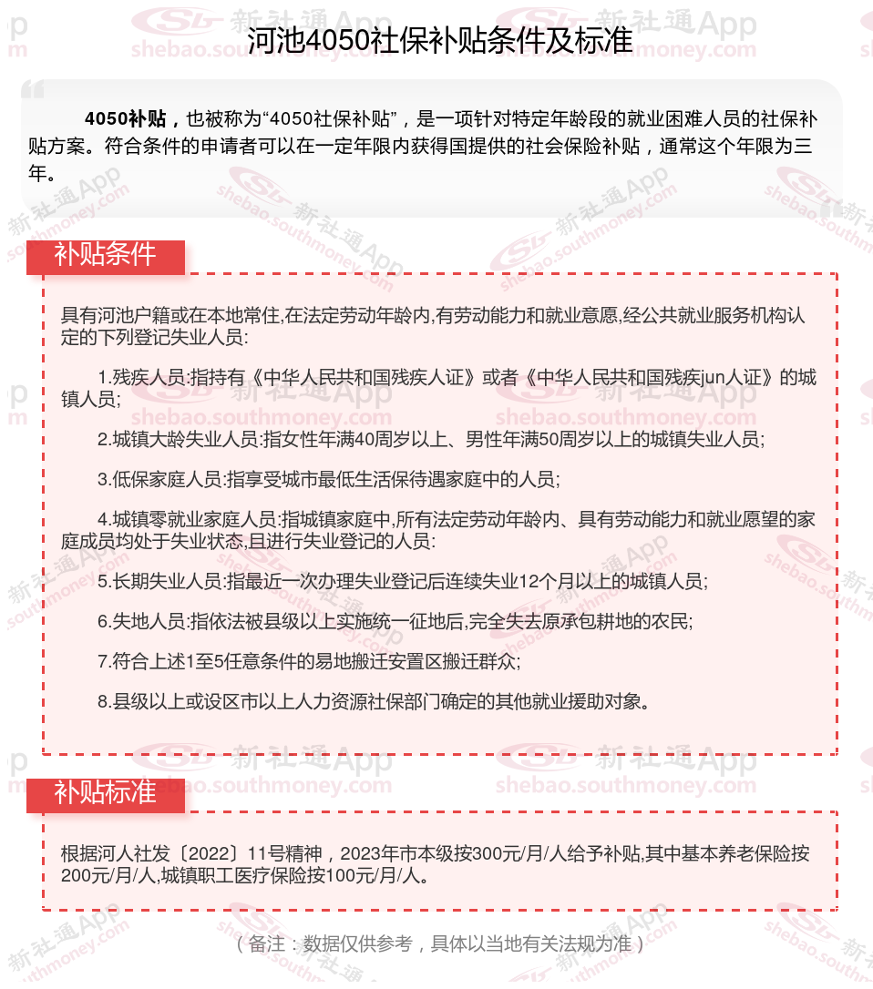 二、2025年河池4050社保补贴标准及条件,最新如下: