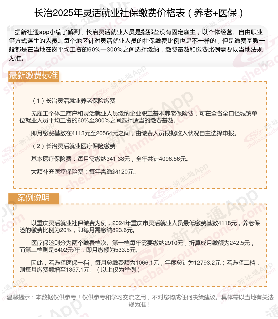 2025长治灵活就业社保缴纳基数是多少?长治灵活就业人员社保交15年领多少?根据新社通app-社保缴费查询工具提供的2025社保缴费标准详情数据: