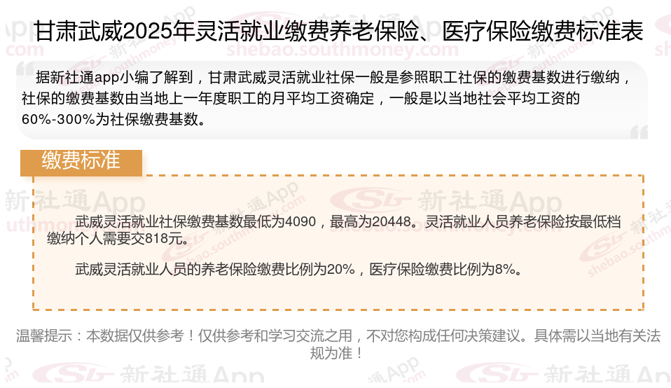 以上就是甘肃武威灵活就业社保缴费的全部内容,数据及内容供参考!希望对你有帮助,欢迎关注新社通app解锁更多社保专业资讯。