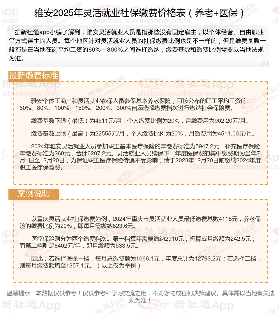 以上就是带来雅安灵活就业社保缴费标准相关知识,内容供参考,希望对你有帮助,欢迎关注/下载新社通app解锁更多社保专业资讯。
