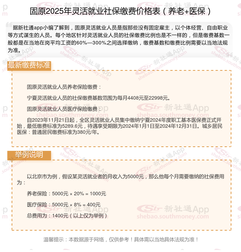 据新社通app数据显示,固原灵活就业养老保险缴费基数2024-2025年最新标准如下: