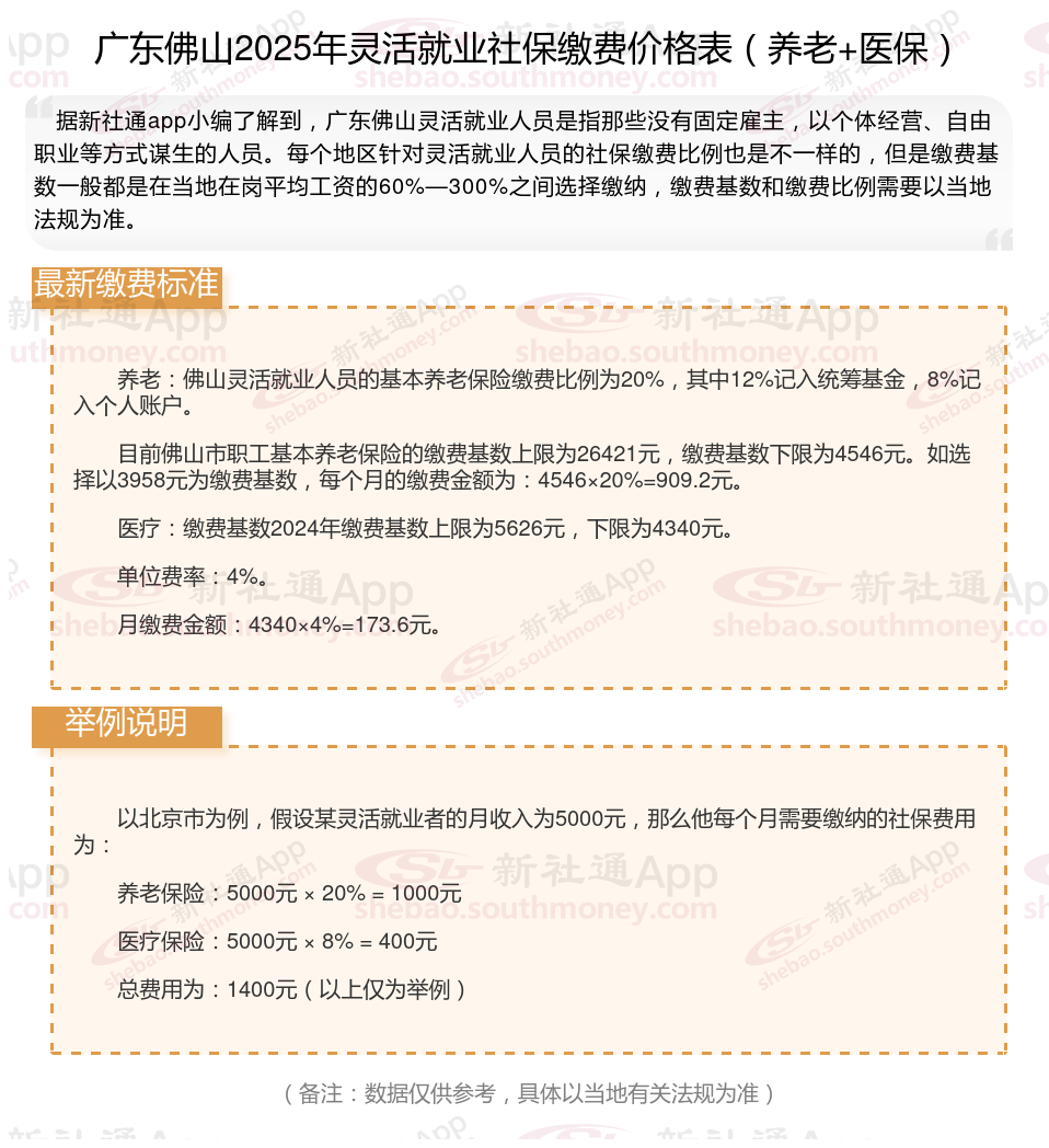 2024-2025年广东佛山灵活就业人员社保缴费标准是多少?社保交完退休能领多少钱?下表是2024-2025年广东佛山社保费用明细参考,根据新社通app-社保缴费查询工具提供的最新数据如下: