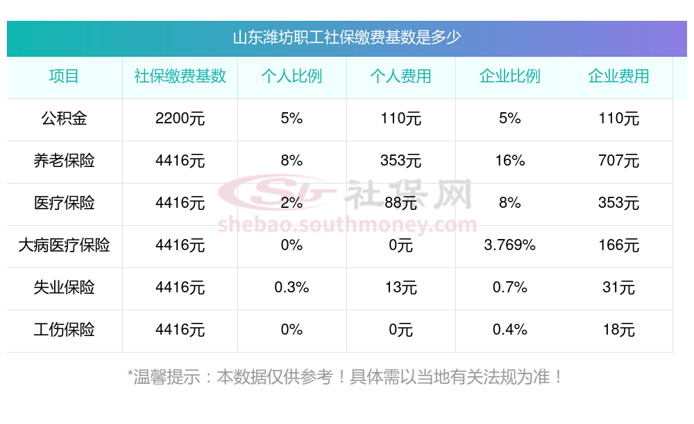 2025年山东潍坊社保缴费多少钱?下表是2024-2025年山东潍坊社保费用明细参考,新社通app-社保缴费查询工具提供的最新数据如下: