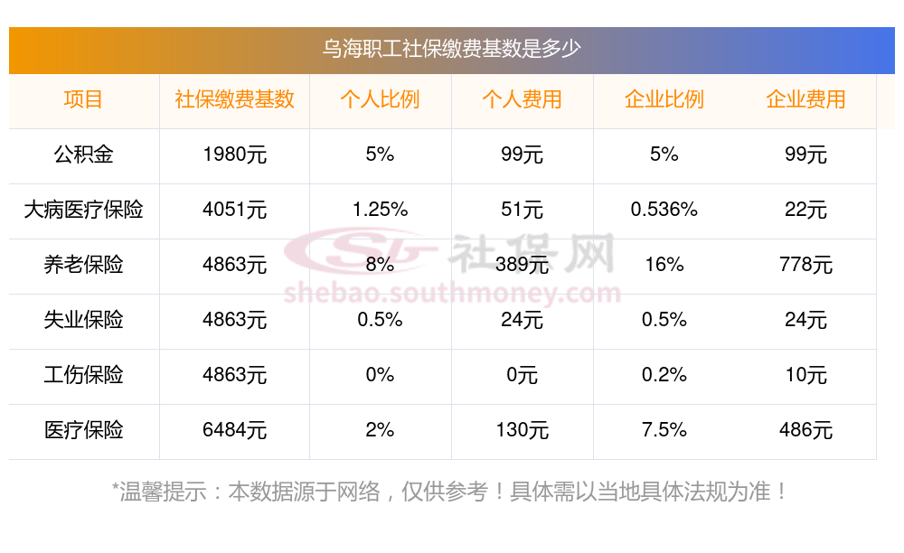 2025年乌海社保缴费多少钱?下表是2024-2025年乌海社保费用明细参考,新社通app-社保缴费查询工具提供的最新数据如下: