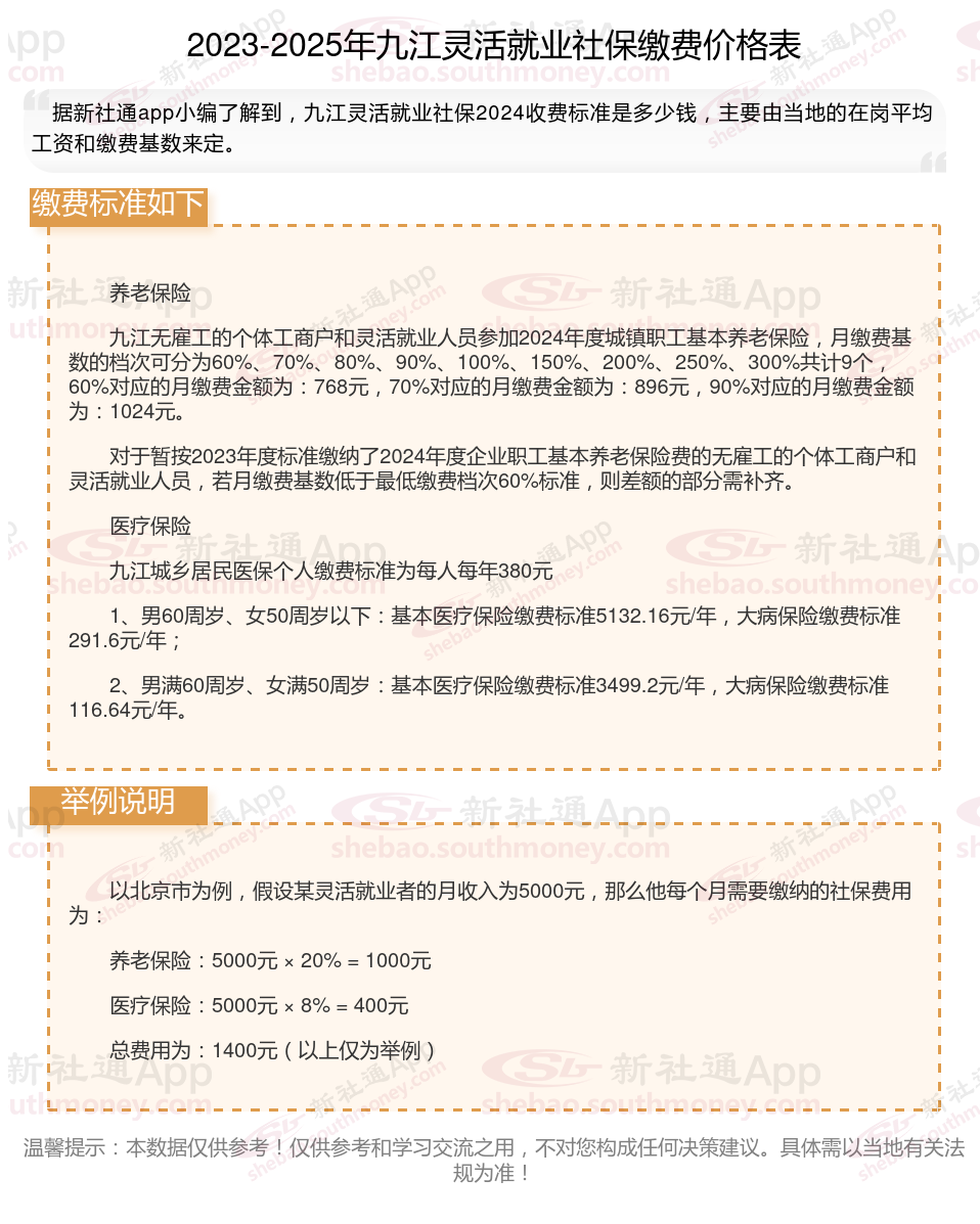 据新社通app数据显示,九江灵活就业养老保险缴费基数2024-2025年最新标准如下: