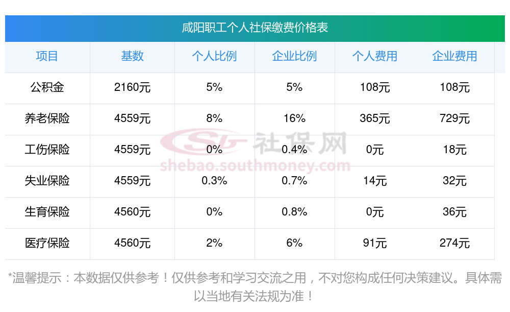 2025年咸阳社保缴费多少钱?下表是2024-2025年咸阳社保费用明细参考,新社通app-社保缴费查询工具提供的最新数据如下: