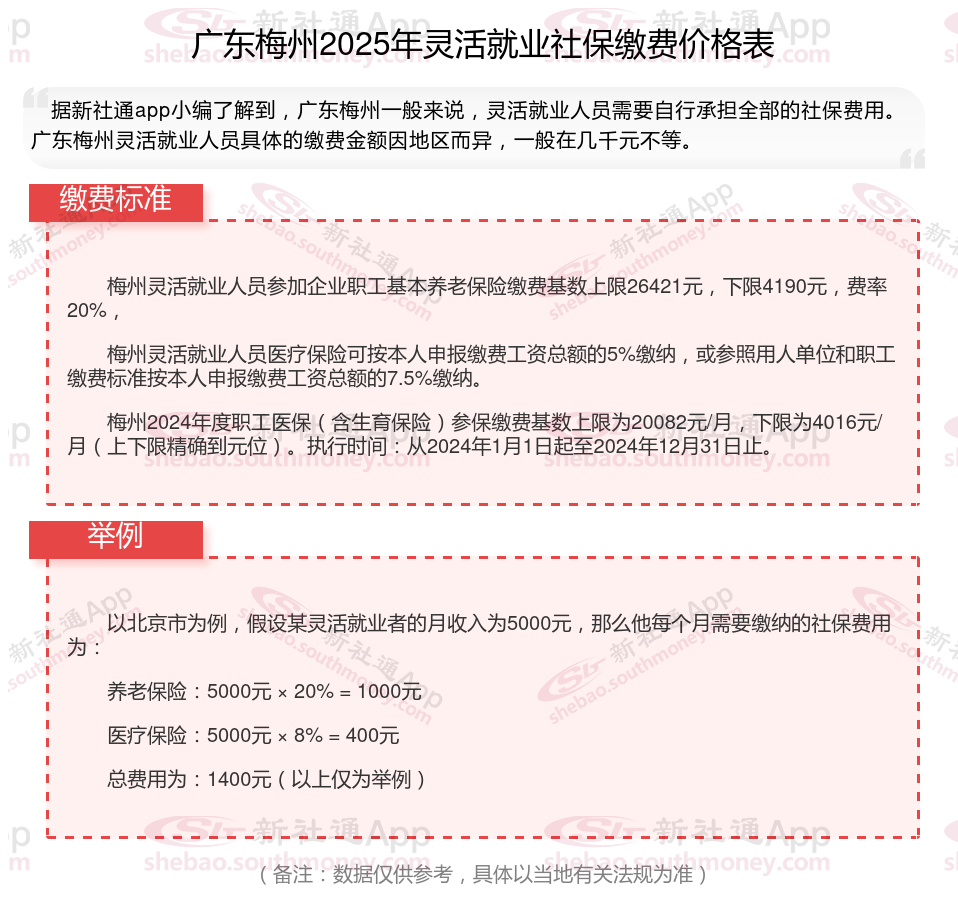 那么,广东梅州灵活就业社保缴费标准是多少?个人社保,要交多少钱一个月?根据新社通app-社保缴费查询工具提供的2025社保缴费标准详情数据: