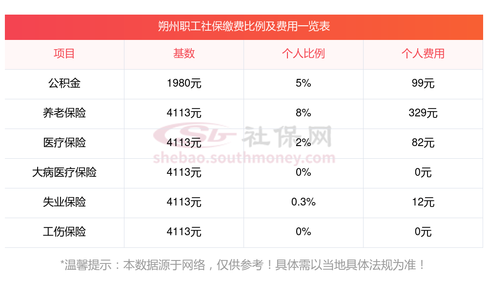 2025年朔州5险缴费标准是多少,2025年朔州社保缴费多少钱?下表是2025年朔州社保费用明细参考,新社通app-社保缴费查询工具提供的最新数据如下: