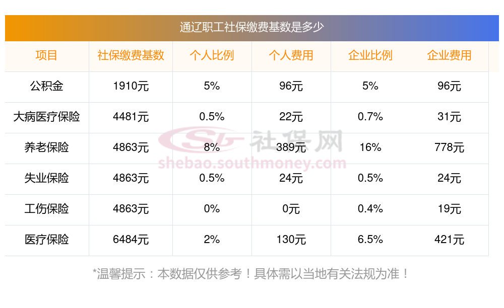 五险一金扣多少?通辽五险一金扣多少钱?下表是2024-2025年通辽社保费用明细参考,新社通app-社保缴费查询工具提供的最新数据如下: