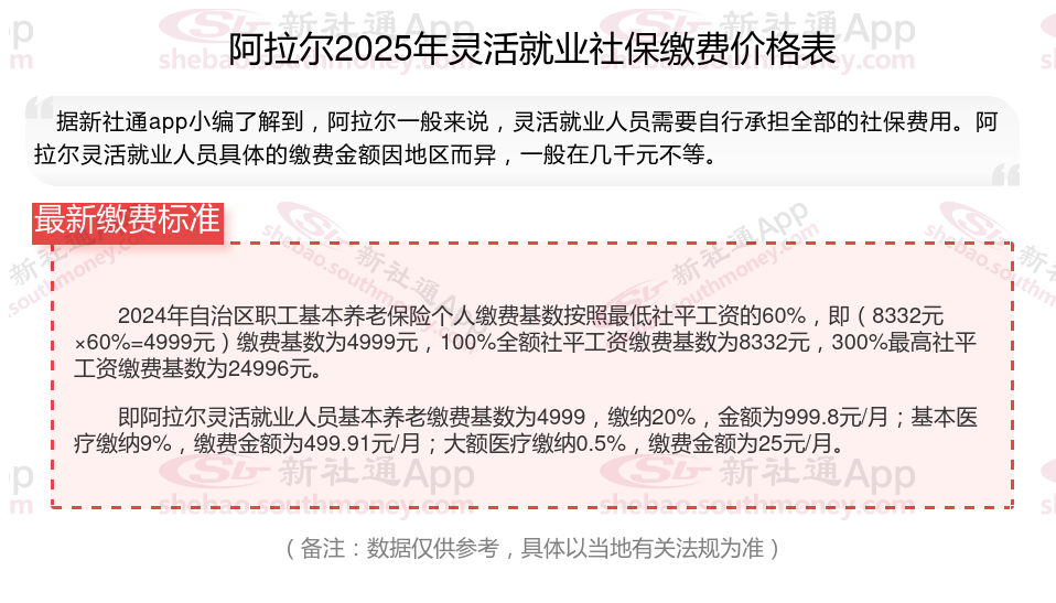 即阿拉尔灵活就业人员基本养老缴费基数为4999,缴纳20%,金额为999.8元/月;基本医疗缴纳9%,缴费金额为499.91元/月;大额医疗缴纳0.5%,缴费金额为25元/月。